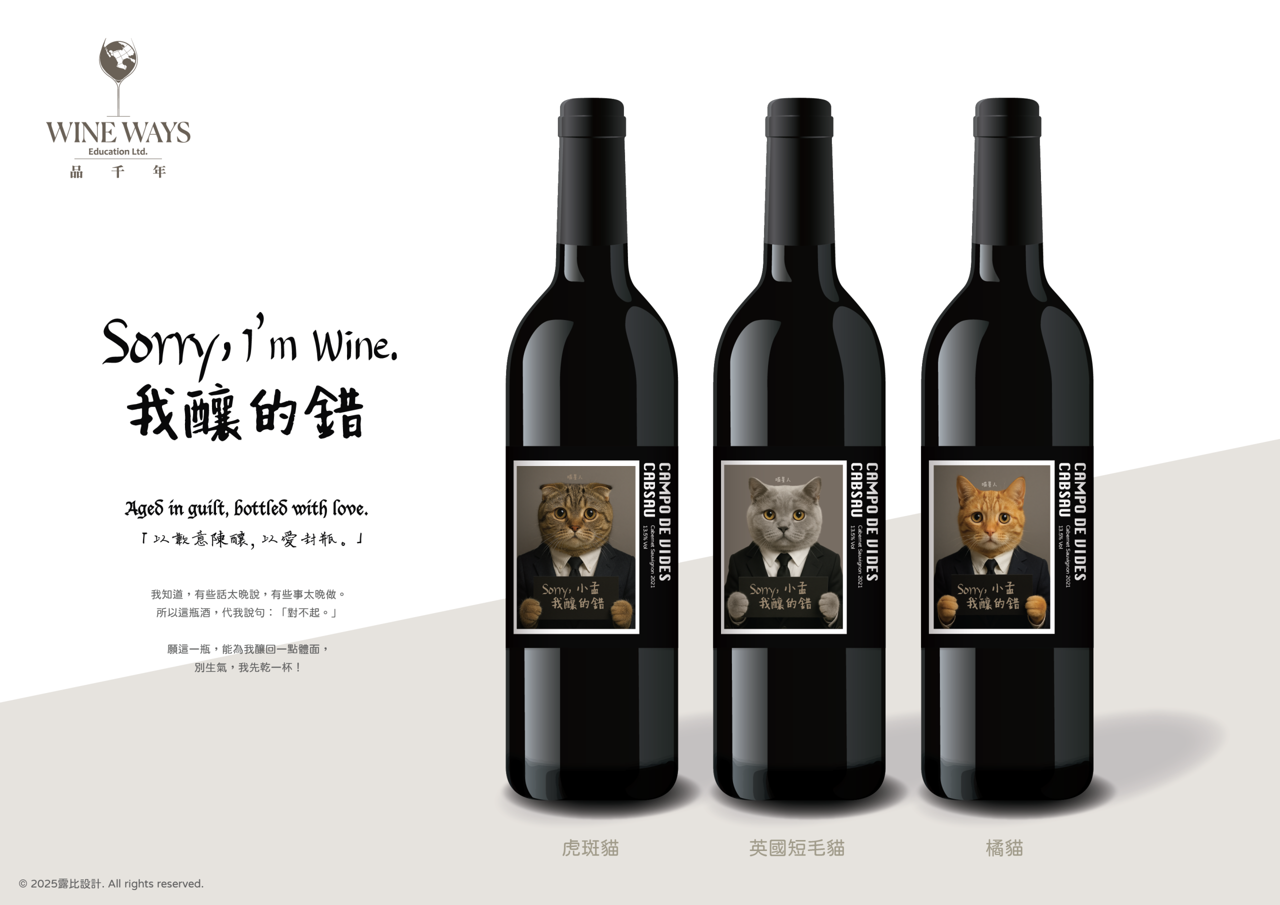 特別提醒,此為客製化設計酒標商品,部分無法更動敬請見諒。提供您選擇主題風格後,搭配指定紅/白酒,製作成專屬的情感酒品禮物。 1.可以客製設計的地方:貓咪品種、手拿牌的字。 另有微笑貓咪可選擇。 2.可以增加單色LOGO及文字,LOGO請提供AI檔或png去背檔案。(若LOGO無單色會協助調整) 3.固定設計無法更動的有:下方英文為酒莊名字及葡萄產區品種名稱。